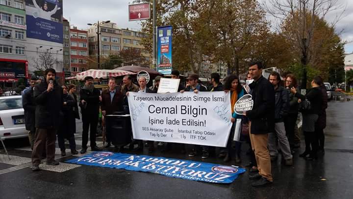 Birkaç ay önce İstanbul’da en büyük eğitim ve araştırma hastanelerinden biri olan Çapa Tıp Fakültesi’nin personel yemekhanesinde, iddaya göre bağırsak iltihabına yol açan Salmonella bakterisi bulundu. Yemekhanede yemek yiyen çalışanların birçoğu aynı şikayetle doktora başvurdu. Olayı araştırarak bakteriyi tespit eden taşeron işçi Cemal Bilgin ise, çalışanların sağlığını korumaya çalıştığı için işinden oldu. Yaklaşık 40 personelin zehirlenmesinin ardından hastane yönetimine “Yemeklerde bakteri mi var” diye sorunca işten atılan Çapa Tıp Fakültesi hasta bakıcısı Cemal Bilgin için düzenli olarak destek yürüyüşleri düzenleniyor. Sağlık çalışanları, “Taşeron mücadelesinin simge ismi Cemal Bilgin işe iade edilsin” pankartı açıyorlar.