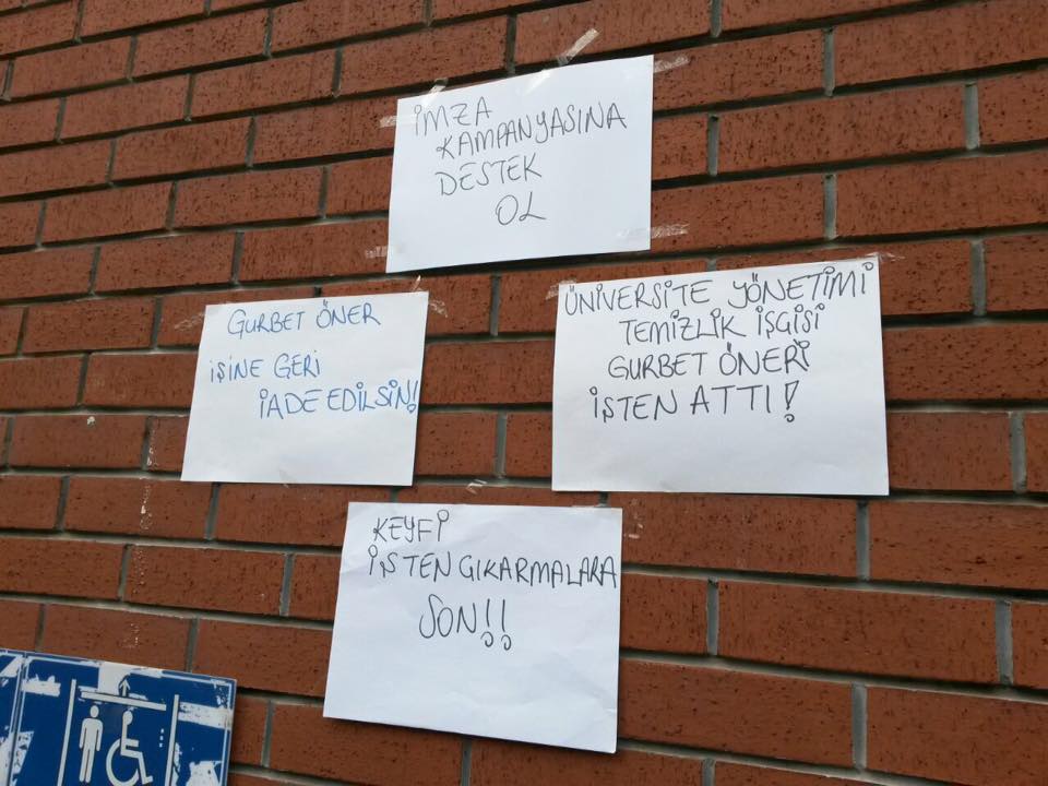 İşçilerden, öğrencilerden ve okuldaki tek sendika Eğitim-Sen’den gizli bir şekilde temizlik işçilerinin taşeron firma ihalesini geçtiğimiz aylarda gerçekleştiren okul yönetimi, bu ay da neden göstermeksizin Gurbet Öner’i işten çıkaracağını duyurdu. Sağlık kontrolü sırasında Gurbet Öner’e 1 Ocak tarihinden itibaren çalışmayacağının haber verilmesi ile duyulan haberin ardından Eğitim-Sen temsilcileri üniversite yönetimi ile görüştü. Fakat ne işten çıkartılan Öner’e ne de Eğitim-Sen temsilcilerine Öner’in işten çıkartılacak olmasının nedeni söylenmedi.
