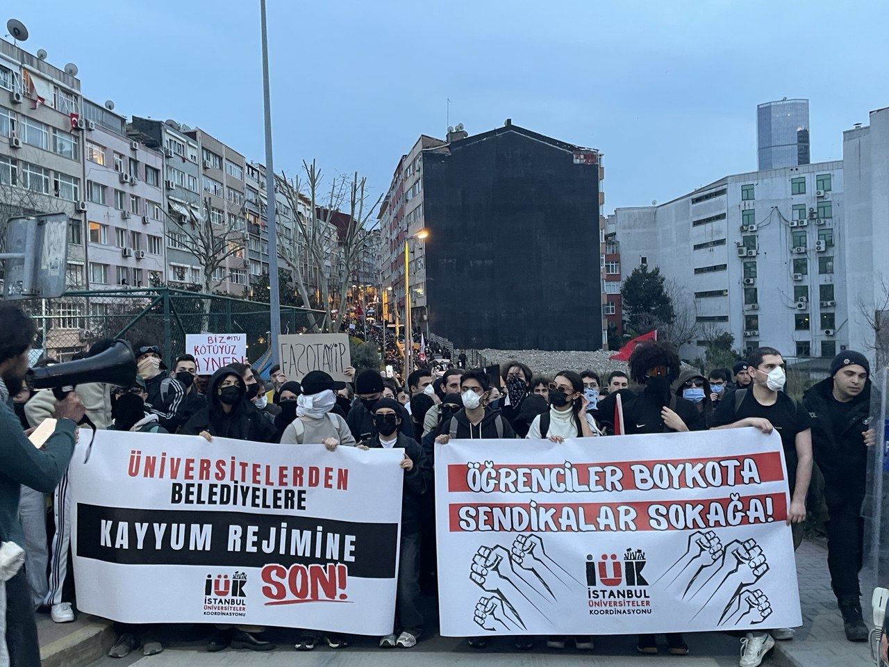İstanbul’un dört bir yanında günlerdir mücadele eden üniversite öğrencileri olarak bizler, artık bir “kayyum rejimi” olarak adlandırabileceğimiz bu rejim karşısında hiç olmadığımız kadar güçlü ve organize bir şekilde duracağız. Bu bağlamda, şimdiden 10’dan fazla üniversitenin dahil olduğu İstanbul Üniversiteler Koordinasyonu’nun kuruluşunu bu ilk eylemimizle ilan ediyoruz! Biber gazlarınız, plastik mermileriniz, TOMA’larınız bizi yıldıramaz! İstanbul ve çevre illerdeki üniversite öğrencileri olarak mücadelemizi birleştiriyor ve büyütüyoruz! İstanbul’daki tüm üniversiteleri koordinasyonumuza dahil olmaya, ülkenin geri kalanında mücadele eden üniversiteli dostlarımızı da kendi koordinasyonlarını kurmaya davet ediyoruz. Kurtuluş yok tek başına, ya hep beraber ya hiçbirimiz!